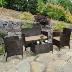 Tangkula 4-Piece Patio Rattan Wicker Conversation Furniture Set Sofa Chair Table Set