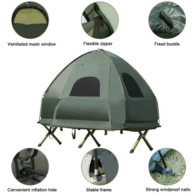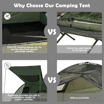 - 【4-in-1 Deisgn】Our camping tent cot comes with a full set of bedding which includes 1 sleeping bag, 1 air-mattress and 1 inflatable pillow (both mattress cover and pillow cover are delivered). And we also provide you with a foot pump and other necessary accessories.