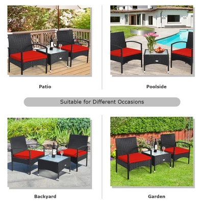 Our 3 PCS patio wicker rattan furniture set can make your outdoor living become better.Made of premium rattan and sturdy steel materials,the chair is stable enough to hold around 330 Ibs weight. Thickened cushions will give you a comfortable seating experience and you will feel that your body has loosened up a bit. Because the whole frame is lightweight,you can easily transport the chair to the yard or beside a swimming pool. Put some drinks and snacks on the table which equipped with a milky white tempered glass and sit on the chair,you can talk with your relatives and your family or just to have a great relax.