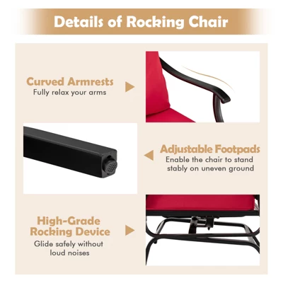 - Multi-Scene Available: Cozy sitting feelings and sturdy steel structure make this rocking bistro set perfect for multiple occasions. You can relax on the glider chair with your friend anywhere you want, such as backyard, poolside and garden. Also, the stylish appearance makes the bistro set a fabulous addition to indoor places.