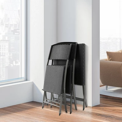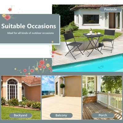 Spend a soothing and lazy afternoon with this 3-piece patio bistro set!The outdoor chair set features plastic-sprayed metal frame and stylish rattan,which can withstand long-time outdoor use. Including 2 chairs and a matching table,the patio set provides a perfect place for you to have a drink and enjoy the pleasure with your beloved one as well. Furthermore,folding design makes them space-saving and easy to carry and store. Plus,the chairs are ergonomically designed with breathable rattan,so that you can sit on the chair for a long time without any discomfort. All in all,this bistro set is the ideal choice for outdoor activities.