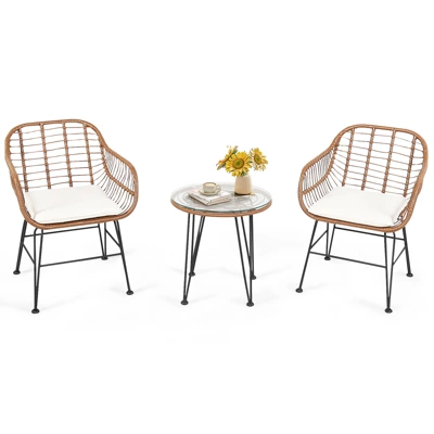 Do you want to have a private space for a nap, afternoon tea or conversation with friends? Our 3-piece outdoor rattan furniture set will be an ideal choice for you. Made of PE wicker and sturdy iron pipes, this patio furniture set has a high bearing capacity and is weather-resistant for a long-time service. The chairs feature ergonomic backrests to provide you with comfortable sitting experience. The tempered glass tabletop can be used to place snakes, books and other daily necessities for easy access. Each chair is equipped with a seat cushion and the cover is easy to take off and washed if it gets dirty. In addition, with a modern and elegant appearance, this conversation set will fit any home decoration.