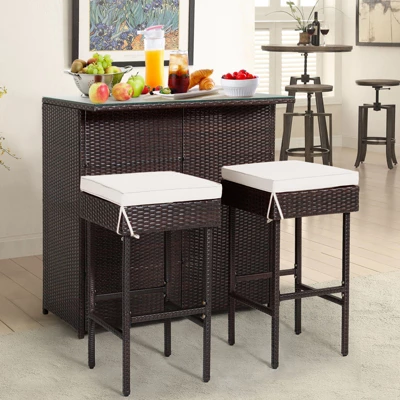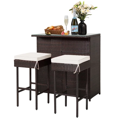 Do you want to enjoy a wonderful drinking time outdoor? Our patio wicker bar set is what you need. It consists of 1 bar table and 2 cushioned stools. The table quipped with 2 shelves can help organizing snacks, tools, boxes or other necessary items. Cushioned stool will provide users with super comfort. This set is made of PE wicker and sturdy frame, so you don’t need to worry about the stability and durability. Worth having it!