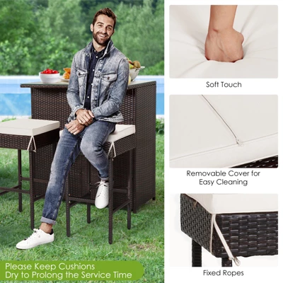 - Selected Material with Delicate Workmanship: Made of heavy-duty and power-coated iron, the frame of 3 piece patio bar set is sturdy and rust-resistant. It won’t deform or shake when you use the set. And wrapped with hand-woven PE wicker, the set has large load capacity and can serve you for long time.
