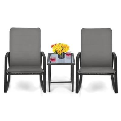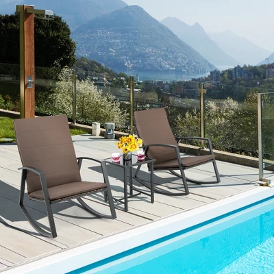 Slow down your pace of life and enjoy a pleasing relaxation with our 3-piece rattan rocking chair set.The ergonomic seat with curved backrest and armrests will make you fully relaxed. And the safe rocking design allows you to relax with more comfort. Coming with cozy cushions filled with soft cotton,the rocking chairs are cozy and soft to sit. Supported by heavy-duty steel frame,both the rocking chairs and coffee table can withstand heavy weight. In addition,the coffee table with sturdy tempered glass tabletop and adjustable footpads is of high stability and functionality. Come to spend leisure time with your best friend on our patio rattan rocking chair set!