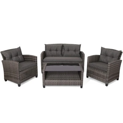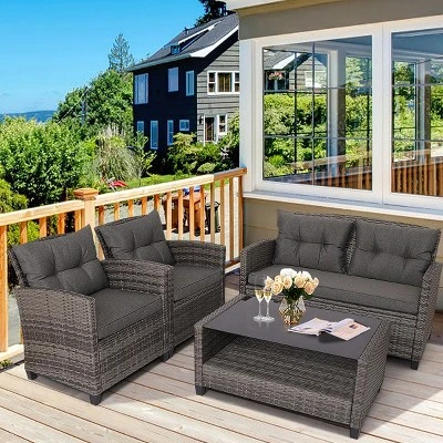 Our 4 pieces rattan patio furniture set includes two single sofas, one loveseat and one coffee table that can accommodate 4-5 persons with ease and comfort. The frame is made of premium steel that is durable and sturdy for strong endurance and superior load-bearing capacity. The thickly cushioned patio sofa set chairs for maximum comfort and excellent seating experience. And with smooth zipper, the cover of the cushion is removable and washable. With lightweight and separate design, you can alter or change the positions or directions according to your needs and requirements. It is ideal for garden, backyard and balcony!