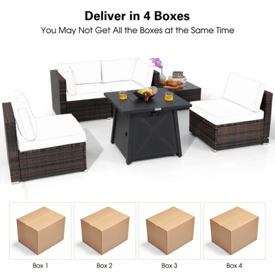 - Ship in 4 Boxes: This 6-piece patio furniture set is packed in 4 boxes (1 box for fire pit table and 3 boxes for patio PE rattan sofa set) that may arrive on different days. The required screws of coffee table and sofas include in the box 1 of patio sofa set. And the box of fire pit table contains the corresponding screws.