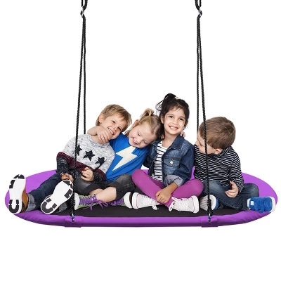 Our swing is suitable for all ages children to play on, providing lots of entertainment for your kids and their friends. The swing is made of the strongest materials we could find like 600D oxford fabric, PP cloth and industrial strength steel frame, ensuring your beloved kids’ safety. With adjustable height and 60″ large seating space, the swing can be suitable for different occasions, such as park, yard or trees, and can be able to hold multiple kids. Take it home! Plat together with your kids!