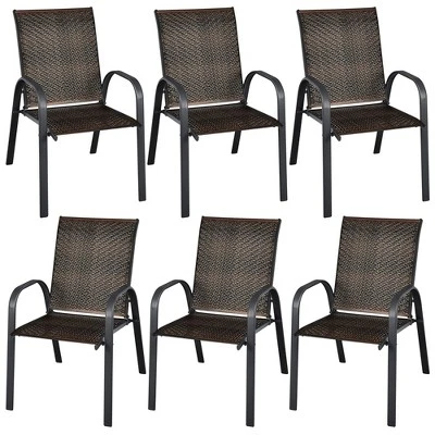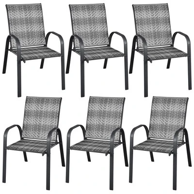 There are 6 chairs in total that are ideal for family gatherings or friend parties. The weather-resistant machine woven PE rattan is selected for more accent outlook,higher density and longer use. At the same time,the steel frame is powder coated for rustproof,which ensures high durability for outdoor use. The reinforced bar and the non-slip foot pads brings strong stability. There are wide and deep backrests and seats as well as smoothly curved armrests for resting your back,spine and arms. After finishing outdoor gatherings,you can stack them together for space-saving.