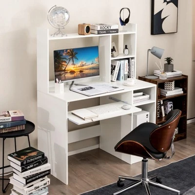 The computer desk with power outlet provides extra power support for your tablet, smartphone, or any other gaming gear. This computer workstation integrates the functions of CPU stand, keyboard tray to create a game space for you to enjoy the game. Featuring spacious desktop and open storage shelves, this writing desk with hutch can easily organize your laptop, keyboard, books, files, and accessories. Constructed by durable engineered wood frame, the computer PC table is absolutely sturdy for long lasting use. This 2-in-1 home office desk can serve many purposes as computer desk, writing table, gaming desk and perfect for small room and apartment or other limited space.