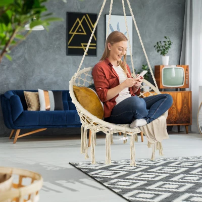 - Hang with High Stability: The hammock chair is equipped with hanging rings and sturdy multi-strand hanging ropes. All the ropes are well hand-woven and super sturdy, so you can swing with high-level security. Also, you can hang this hammock chair in two different ways: one-point and two-point.
