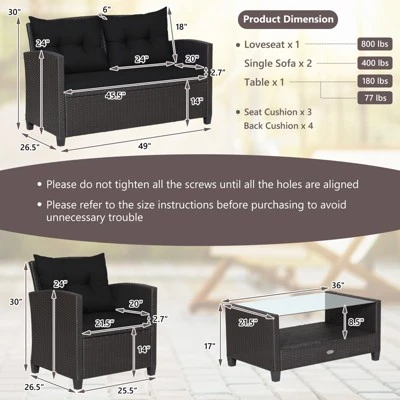 - 【Shipping & Assembly】 This 4-piece patio furniture set will be shipped in 3 boxes, so the delivery time may vary. And box 3 includes all needed screws and straightforward instruction, which facilitate the installation. Please do not tighten all the screws until all the holes are aligned, otherwise some screws holes may not line up well.