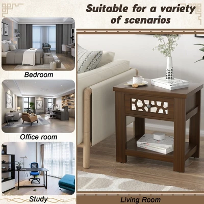 - Private Drawers & Open Shelves: This side table will bring you extra storage space! The table top is great for picture frame or other decorative items, while the drawers can store personal items. The lower shelf is perfect for books or potted plants. And there is no doubt that a side table with storage will keep your room neat and tidy.